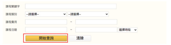 | 01 輸入關鍵字、類別、費用及日期,點擊「開始查詢」即可 |