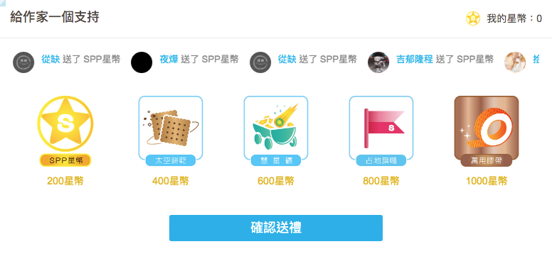 虛擬幣獎勵讀者有送禮機制(星幣),送給心儀的作者或書籍。當星幣達標時,作者可申請兌現領取。 |