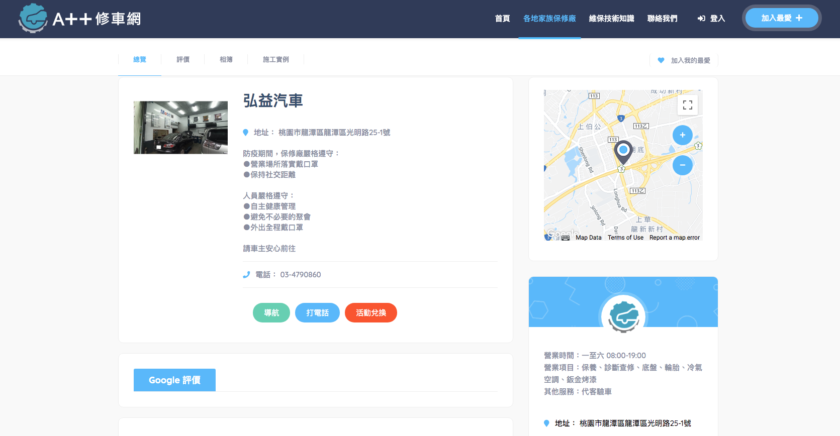 保修廠會員可登錄相關服務以外,還可顯示google評價功能,來進一步推廣自家形象。開車族可在會員中心裡紀錄車子的保養歷程,站內也能即時搜尋到離自己最近的保修廠及收藏功能。 而網站管理員也會不定期釋出優惠活動,來增加保修廠、會員、管理者之間三方的互動。