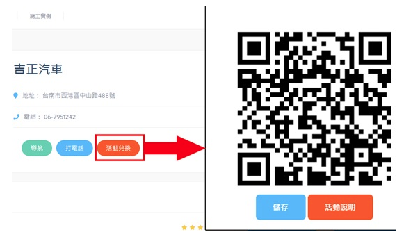 活動QRCODE,兌換折扣在網站上,選擇您要前往的保修廠,點擊「活動兌換」按鈕,登入會員後領取活動QRCODE,並存在手機內。再前往該保修廠進行保養、維修、更換輪胎耗材等消費,並出示活動QRCODE。 |