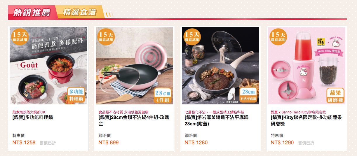 鍋寶好時光平台美食製作教學網。所謂高手就在民間,會員可以分享自己的食譜祕技,也可線上註冊保證卡。站內除了有結合商品的教學,還有專家、部落客、達人等等..來分享營養知識及調養料理等生活文章。 |