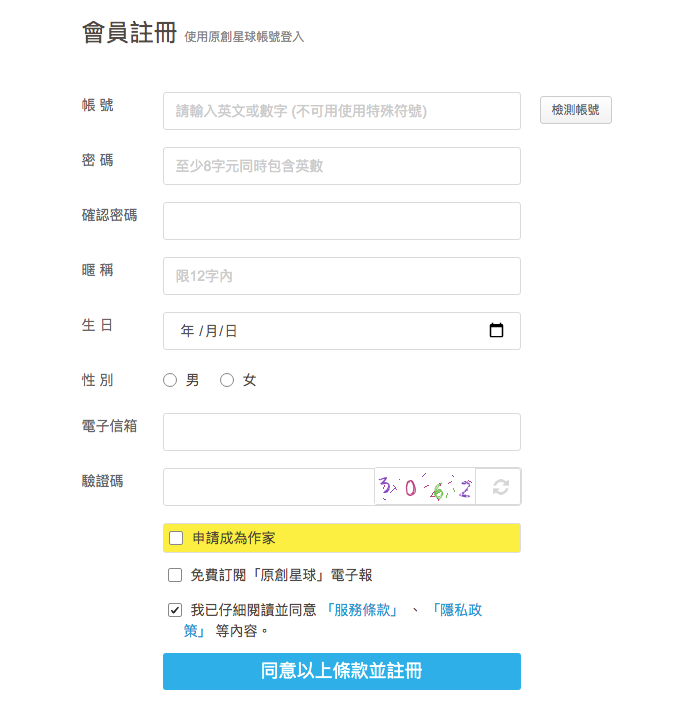 網站會員分2種身份區分兩種身份讀者及作者,註冊時可點擊「申請成為作家」,並可同時為作家和讀者身份。