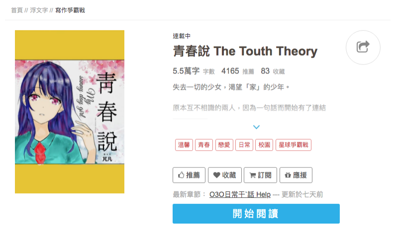 全站標籤因站內分類眾多,特別設計全站標籤,透過條件式過濾,讓使用者能快速找到想看的內容。 此站設置青春、戀愛、校園等標籤等。 |